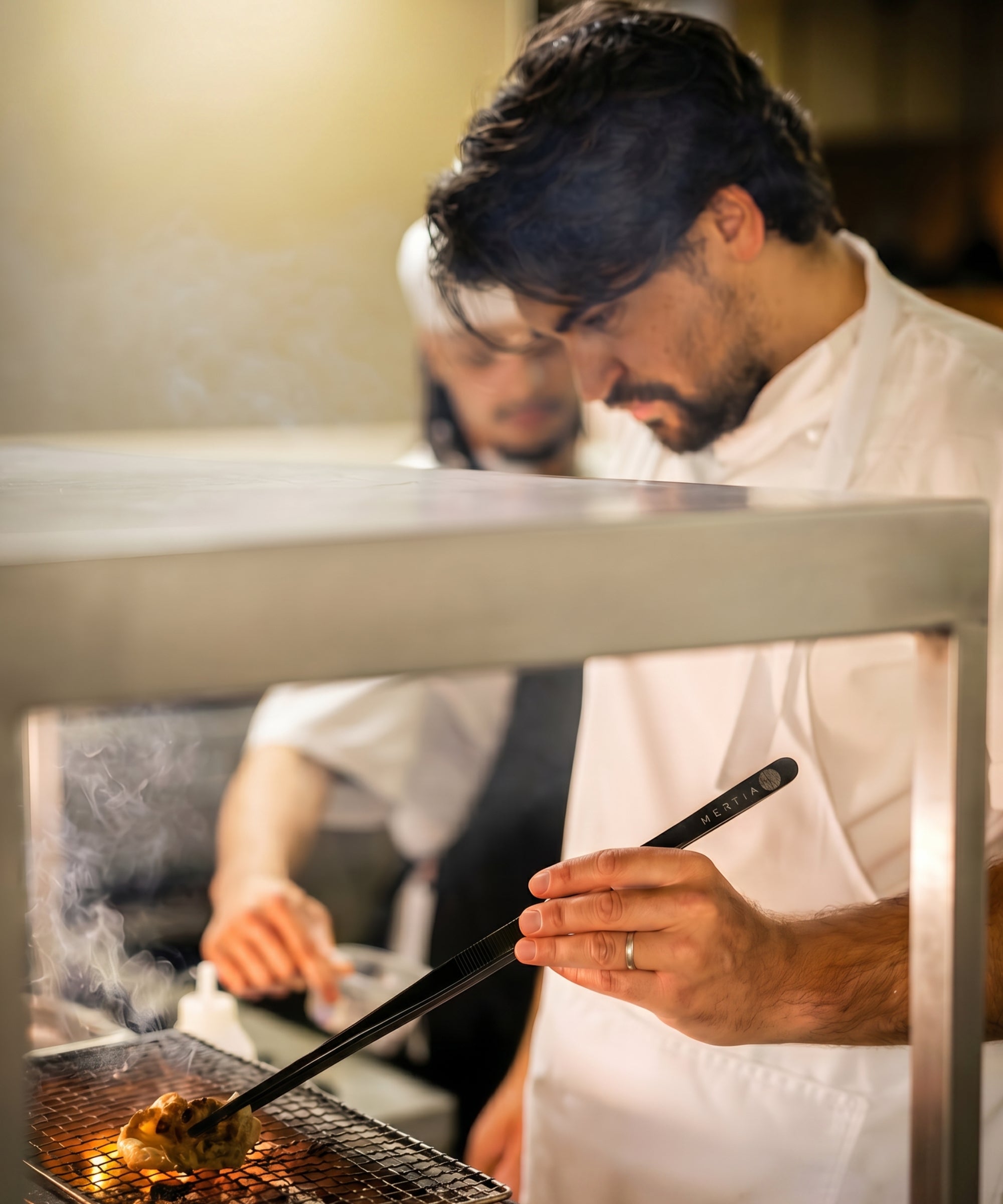 Two Chefs expertly plating a dish using Oui Chef offset tweezers